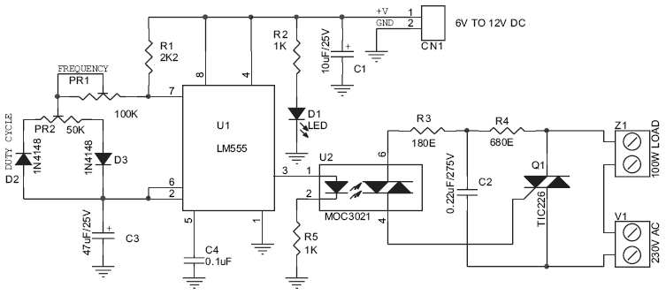 This is the 220V / 200W lamp flasher circuit diagram. The frequency/speed of the lamp flashing can be adjust with the range of 1Hz to 5Hz. You can use the PR1 variable resistor (trimpot) to adjust the flashing speed. The duty cycle of lamp flashing can be adjusted using PR2 variable resistor.