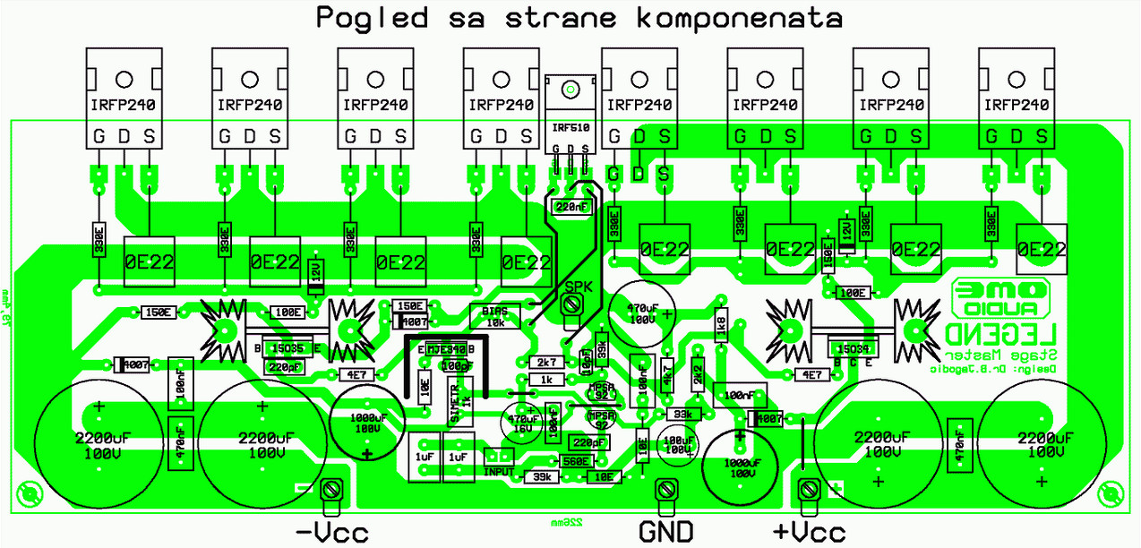 This is the PCB design and component placement for 250 RMS power amplifier, Legend-Stage Master version. In the design, the MOSFETs are both mounted on the PCB and heatsink. If you have difficulty making appropriate heatsink to be mounted on the PCB, you can separate the heatsink from the PCB, mount the MOSFET on the heatsink, then connect the pins of the MOSFET to a PCB using cable.