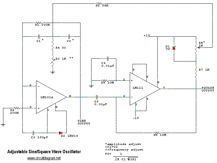 The following scheme diagram is the circuit diagram of simple easily tuned / adjustable sine and square wave oscillator. With this circuit you can easily generate sine/square wave which can be adjusted both the frequency and amplitude.