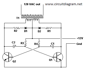 The following diagram is the basic design diagram of inverter circuit. The circuit will convert 12V DC to 120V AC. This basic inverter circuit can handle up to 1000Watts supply depends the T1, T2 and transformer used. Please see the note.