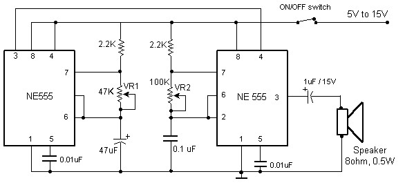 The first 555 IC (left IC) oscillates at about 1Hz. The second IC (gight IC) is turned ON and OFF by the first IC. The first IC will decide how fast the second IC is turned ON/OFF, while the second IC determines the tone frequency of the output. By adjusting the variable resistor VR1, the changeover rate can be vary. By adjusting VR2 the tone frequency can be altered.
