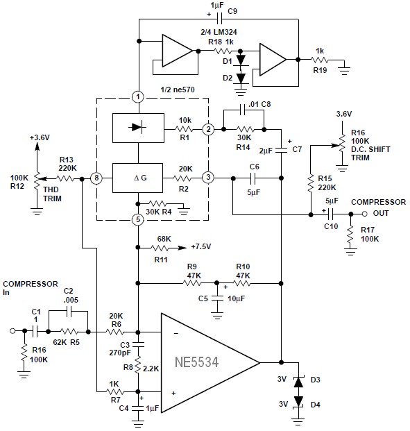 Here is the Hi-Fi compressor circuit with pre-emphasis. The above diagram is a circuit for a high fidelity compressor which uses an external op-amp and has a high gain and wide bandwidth. An input compensation network is required for stability.