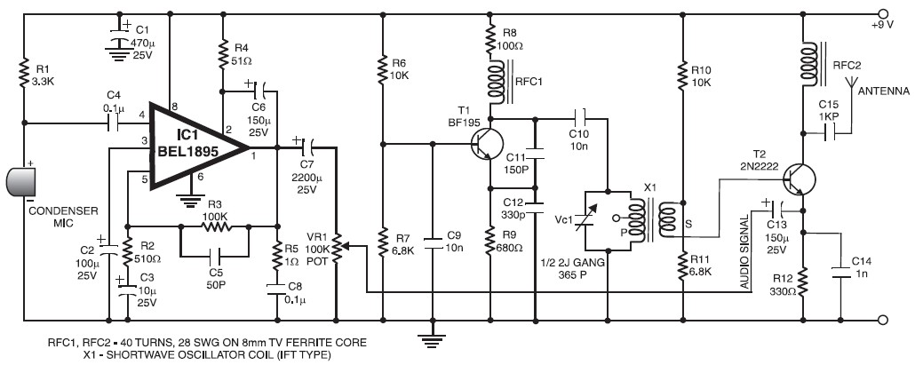 By altering the coil inductance or the capacitance of gang condenser, the frequency of oscillation can be modified. The carrier RF signal from the oscillator is inductively coupled through the secondary of transformer X1 to the next RF amplifier-cum-modulation stage assembled around transistor T2 that is run in class “A” mode. Audio signal from the audio amplifier assembled around IC BEL1895 is coupled to the emitter of transistor 2N2222 (T2) for RF modulation.