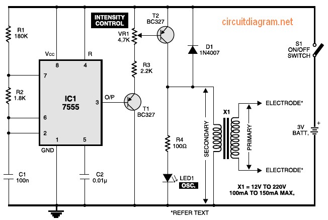 Figure 1 exhibits the circuit with the muscular stimulator. IC 7555 is actually wired just as one astable multivibrator to build about 80Hz pulses. The particular output involving IC1 is fed to be able to transistor T1, whose emitter is actually further connected to the starting of transistor T2 via R3 as well as VR1. The enthusiast of transistor T2 is connected to one end of the secondary turning of transformer X1. The opposite end on the secondary winding from the transformer is connected to ground.