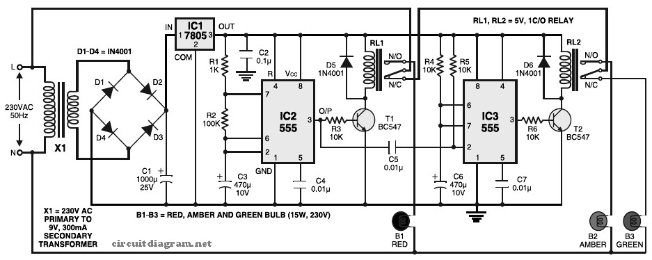 Here the simple traffic light controller which is could be used to educate kids rudiments of traffic light guidelines. The circuit utilizes easily available electronic parts. It generally consists of rectifier diodes (1N4001), a 5V regulator 7805, two timers circuit using IC 555, two relays (5V, single-changeover), three 15W, 230V light bulbs and also several discrete parts.